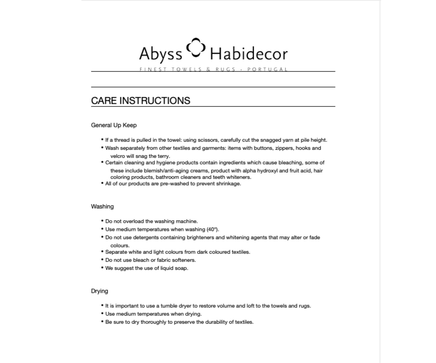 The Abyss Super Pile towels are sewn with a characteristic bias band perfectly with rounded corners. In Portugal, these cloths are dyed in one piece, so that slanted ribbon, terry towelling and even the care labels are perfectly matched. The long fibre (Giza70) of the best cotton from Egypt provides an extremely soft feel, an absorbent texture and a long durability. The bath towels in 60 beautiful colours remain brilliant and wonderfully soft even after washing. This large selection of colours and sizes, the possibility of customisation for your very personal bathroom equipment with different sizes and colours, with hanger or without hanger, the matching bathrobe with individual production and embroidery, makes this Portuguese family business our trustworthy supplier. Only ABYSS & HABIDECOR offers this service and is therefore also a manufacturer of premium equipment for the leading hotels and wellness paradise. The 60 colours can be found in the entire range of ABYSS towels and HABIDECOR bathroom carpets. We would also be happy to advise you by telephone on +49 221-4204894.