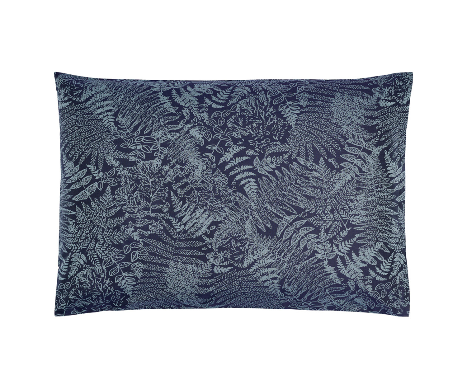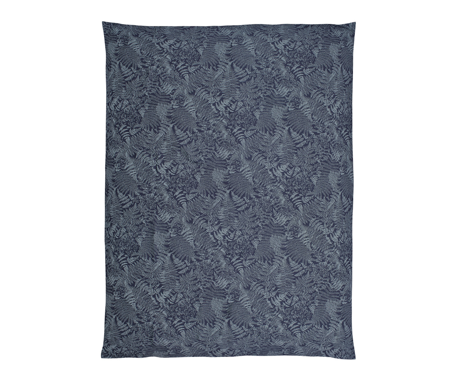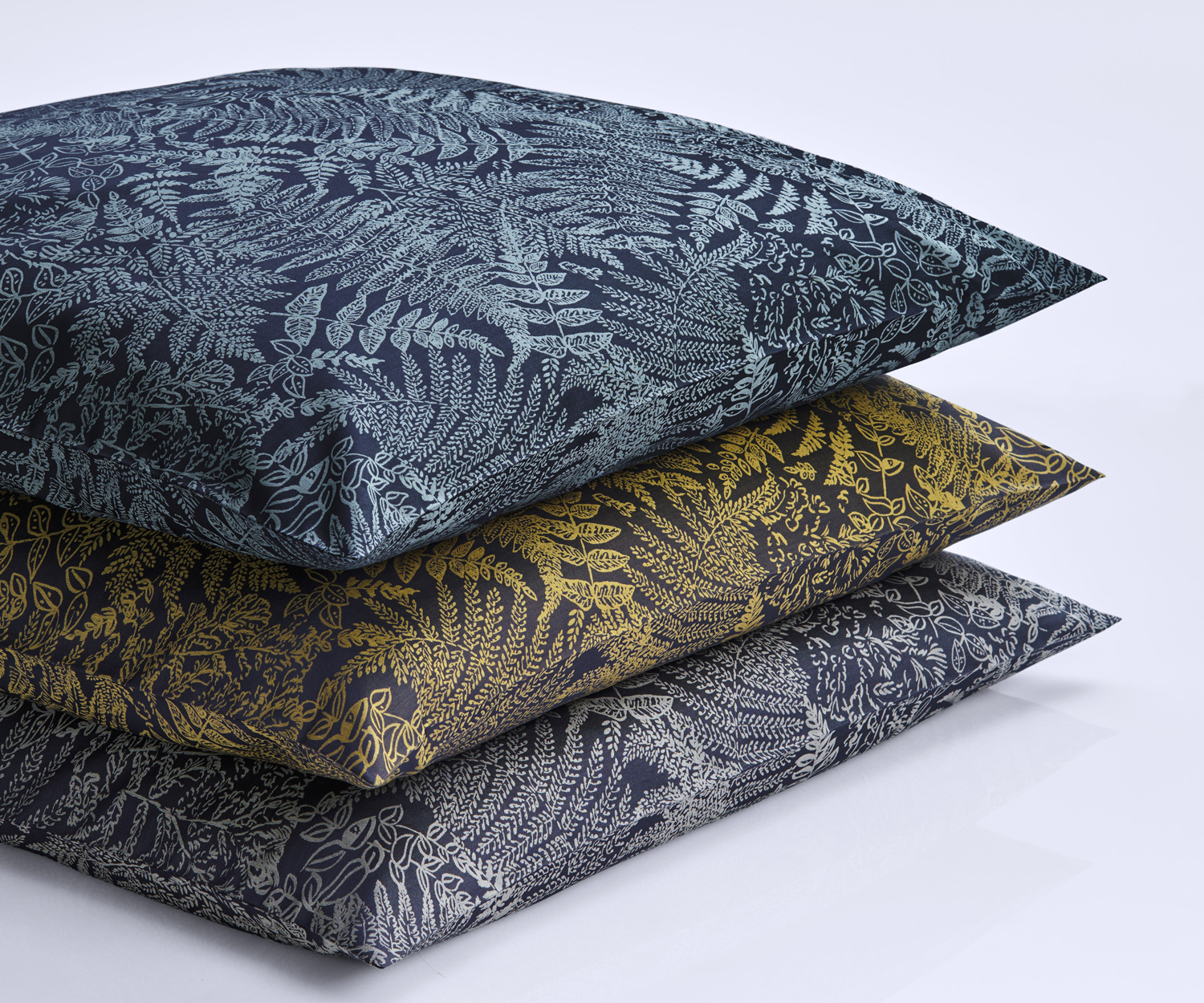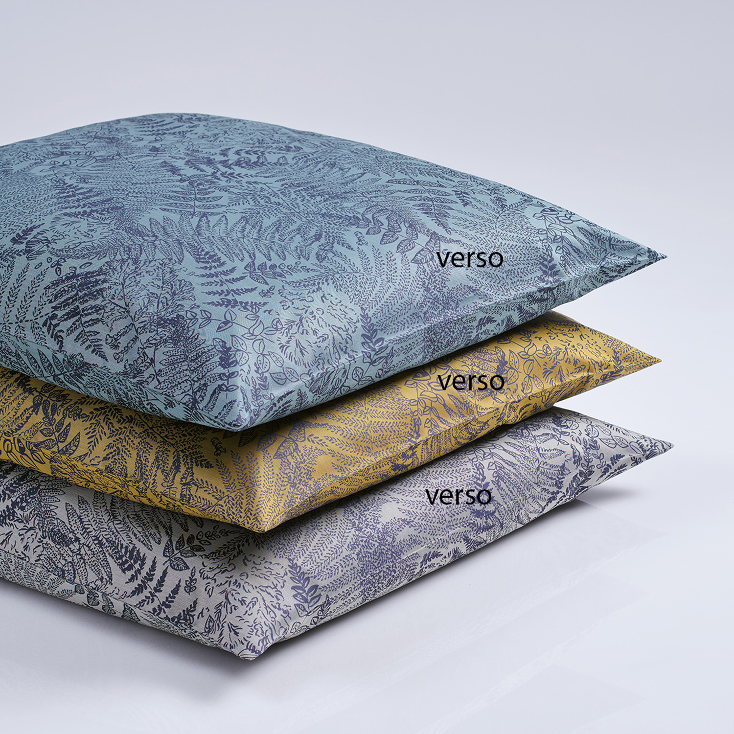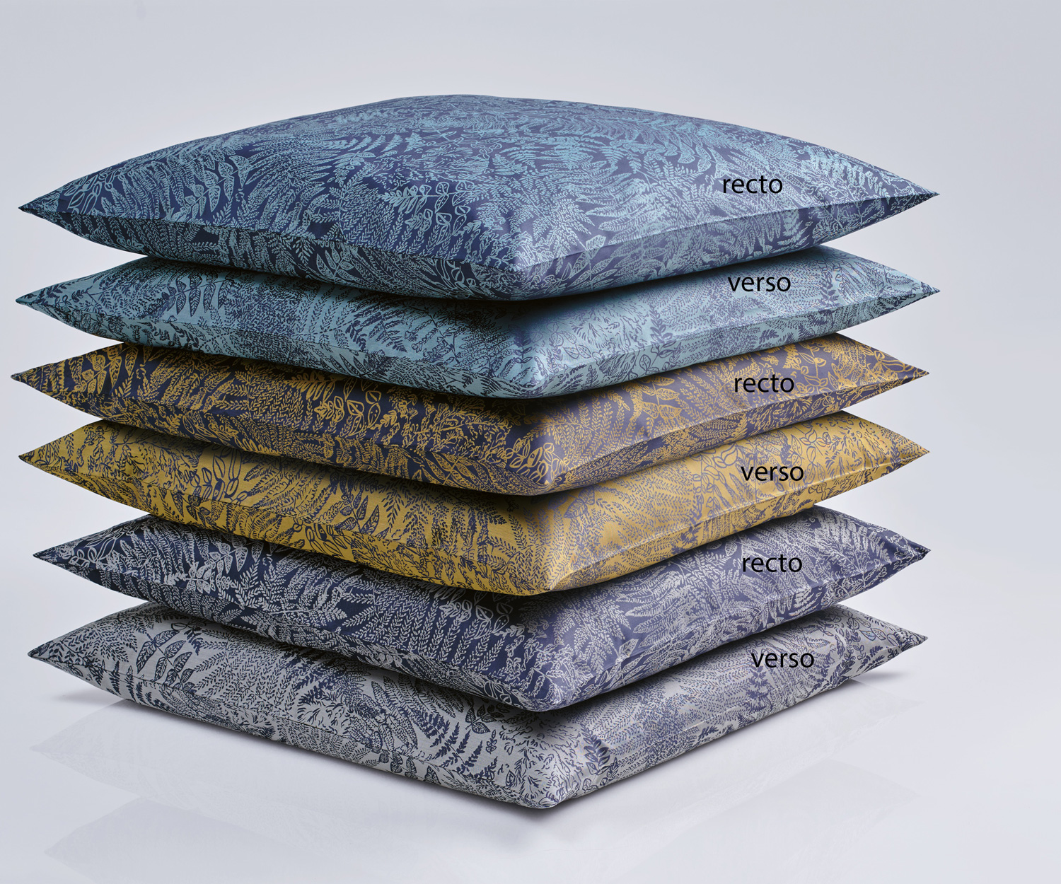 Motivos de helechos finamente dibujados se despliegan en un diseño detallado y brillante, tejido sobre una base oscura con reflejos en oro, plata y azul claro irisado. Gracias a su elaborada técnica de tejido, el tejido ofrece profundidad, sofisticación y puede utilizarse por ambas caras. Elige tu lado favorito – Recto (E50) o Verso (E60) – y personaliza tu cama según tu estilo.