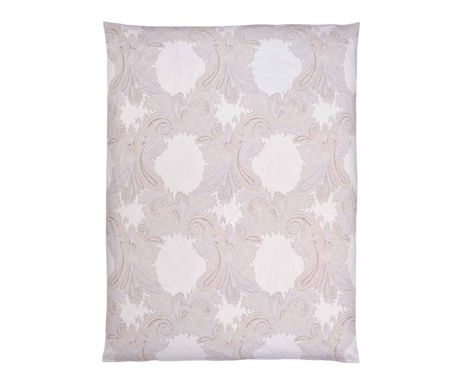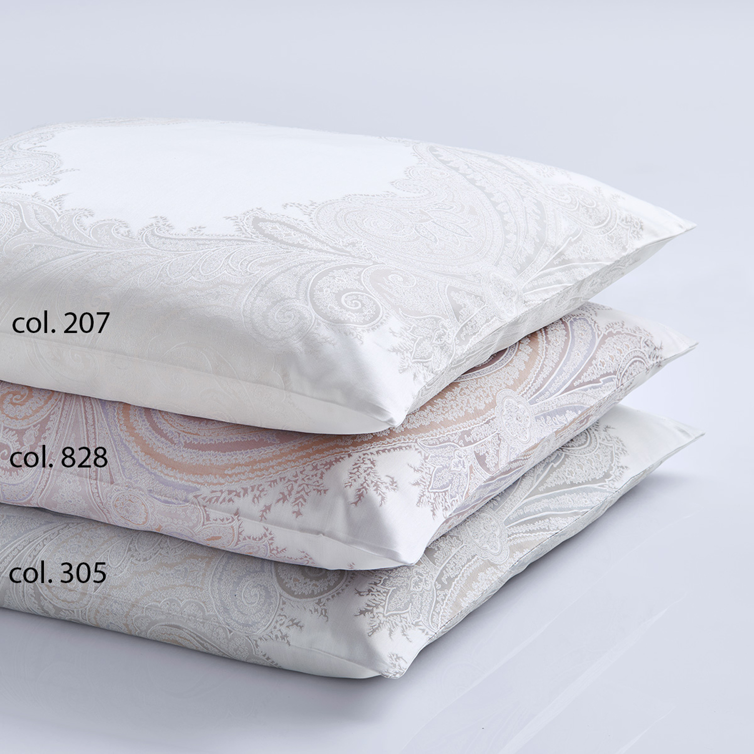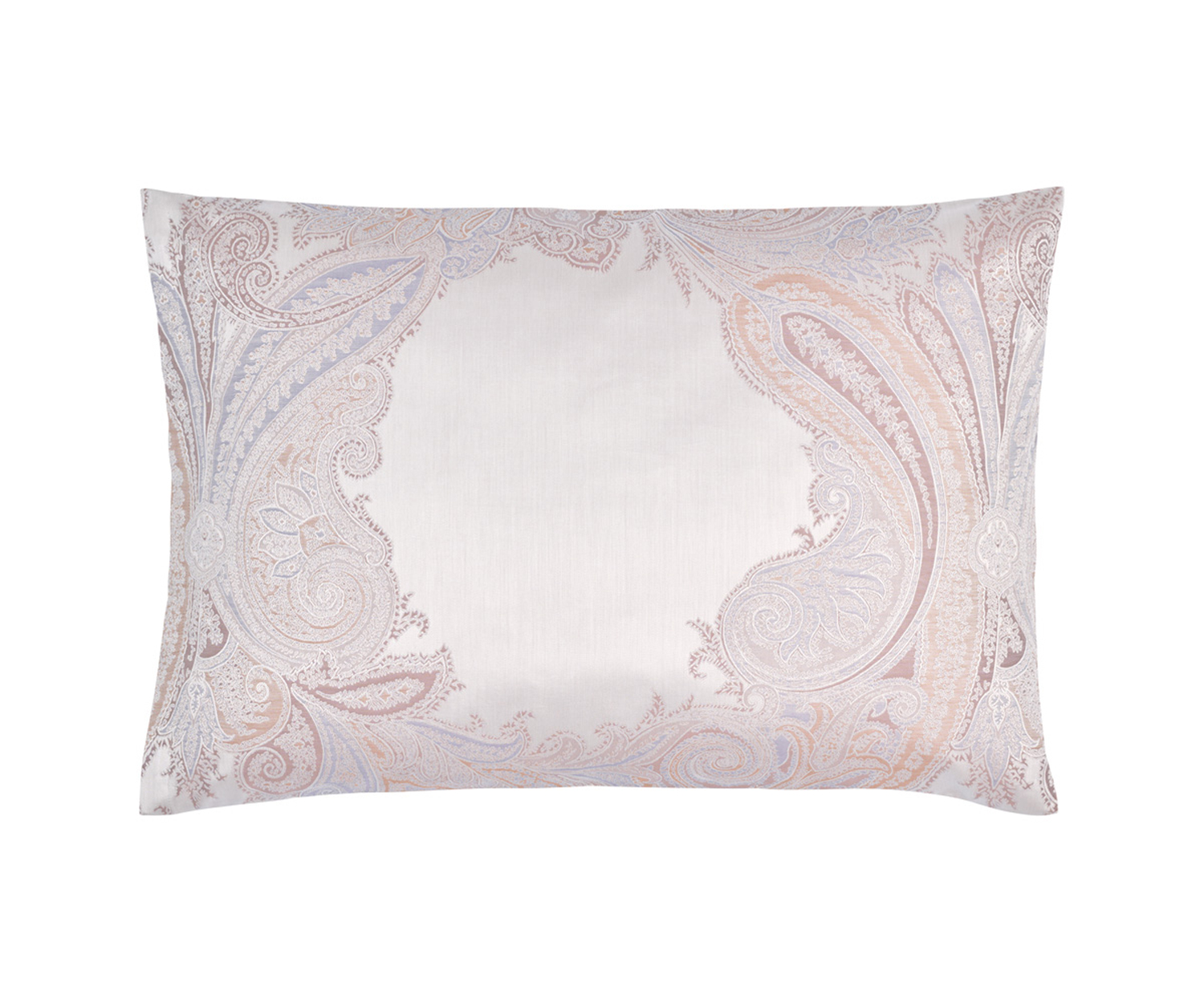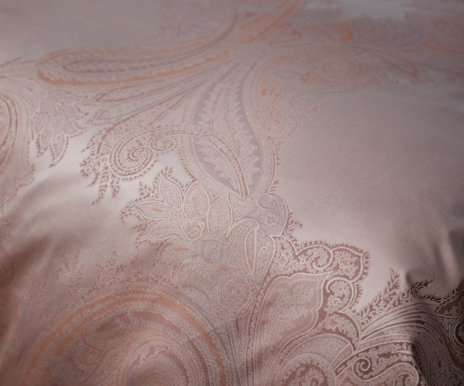 El sofisticado diseño paisley, tejido en uno de los talleres más prestigiosos de Italia, brilla en delicados tonos grises, plateados y rosados. Gracias al refinado juego entre urdimbre y trama satinada, se crea un efecto de profundidad y brillo que fascina a primera vista.