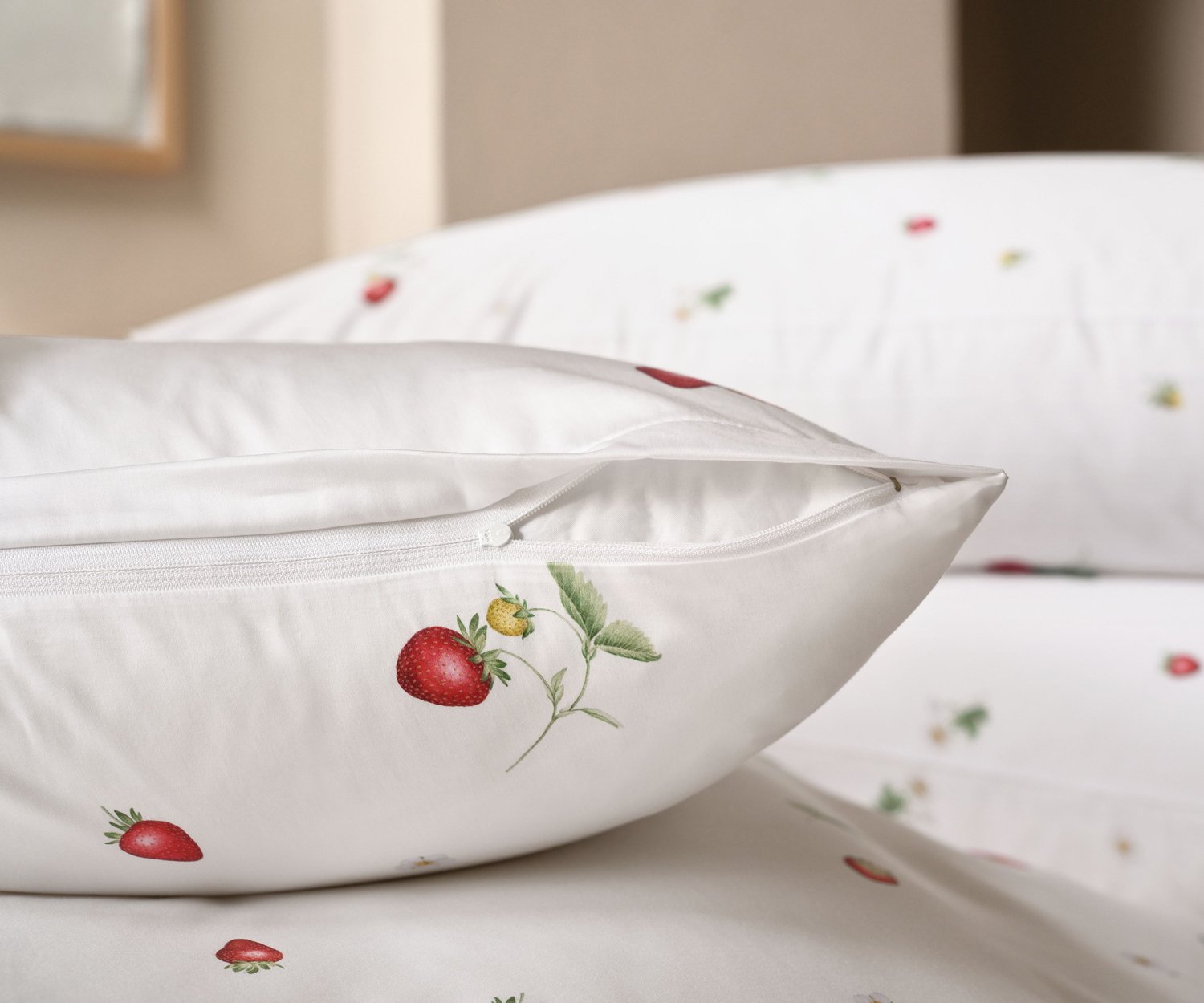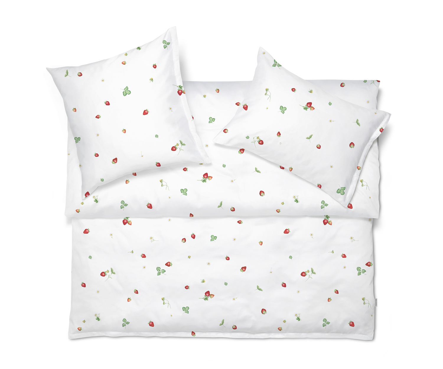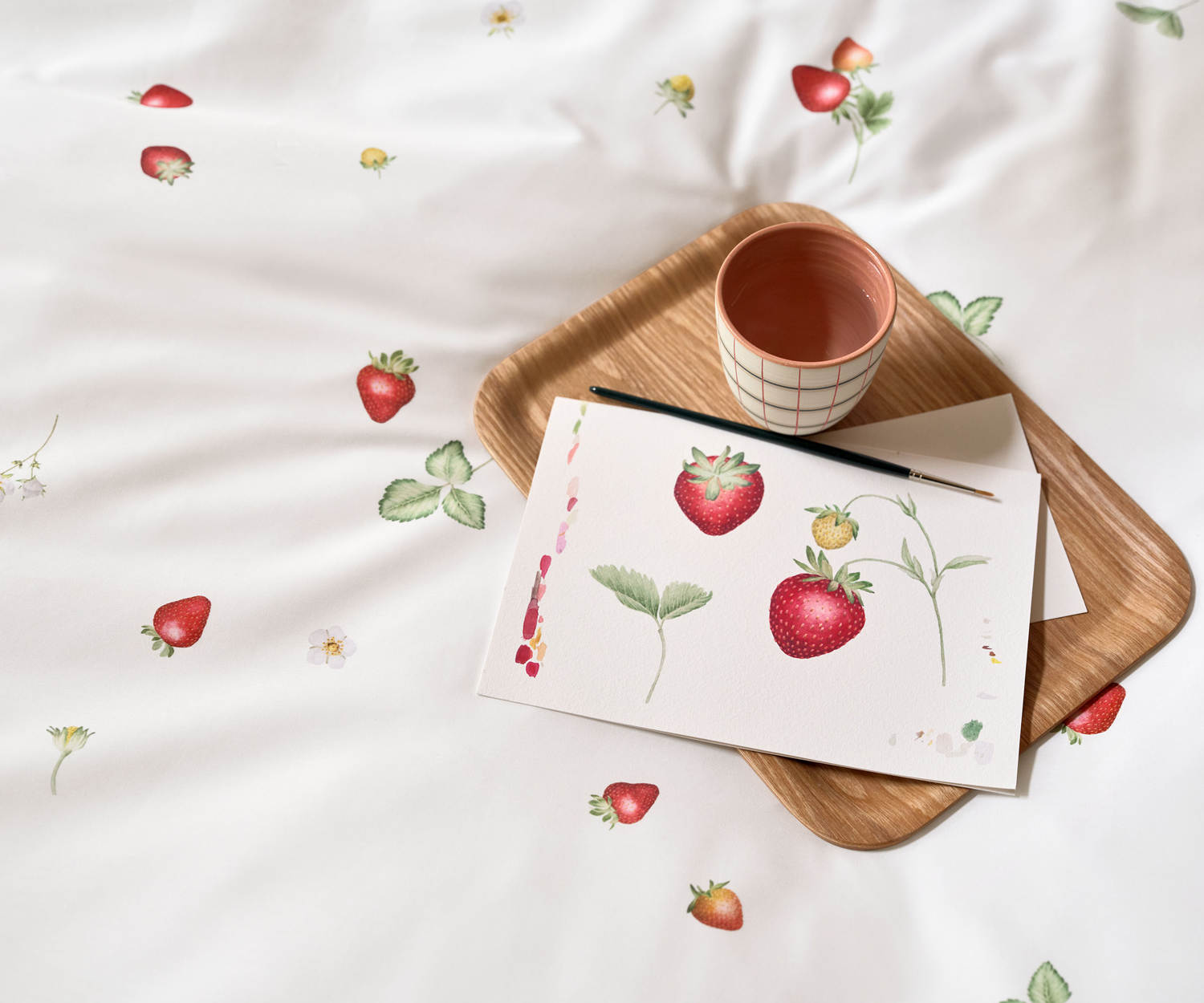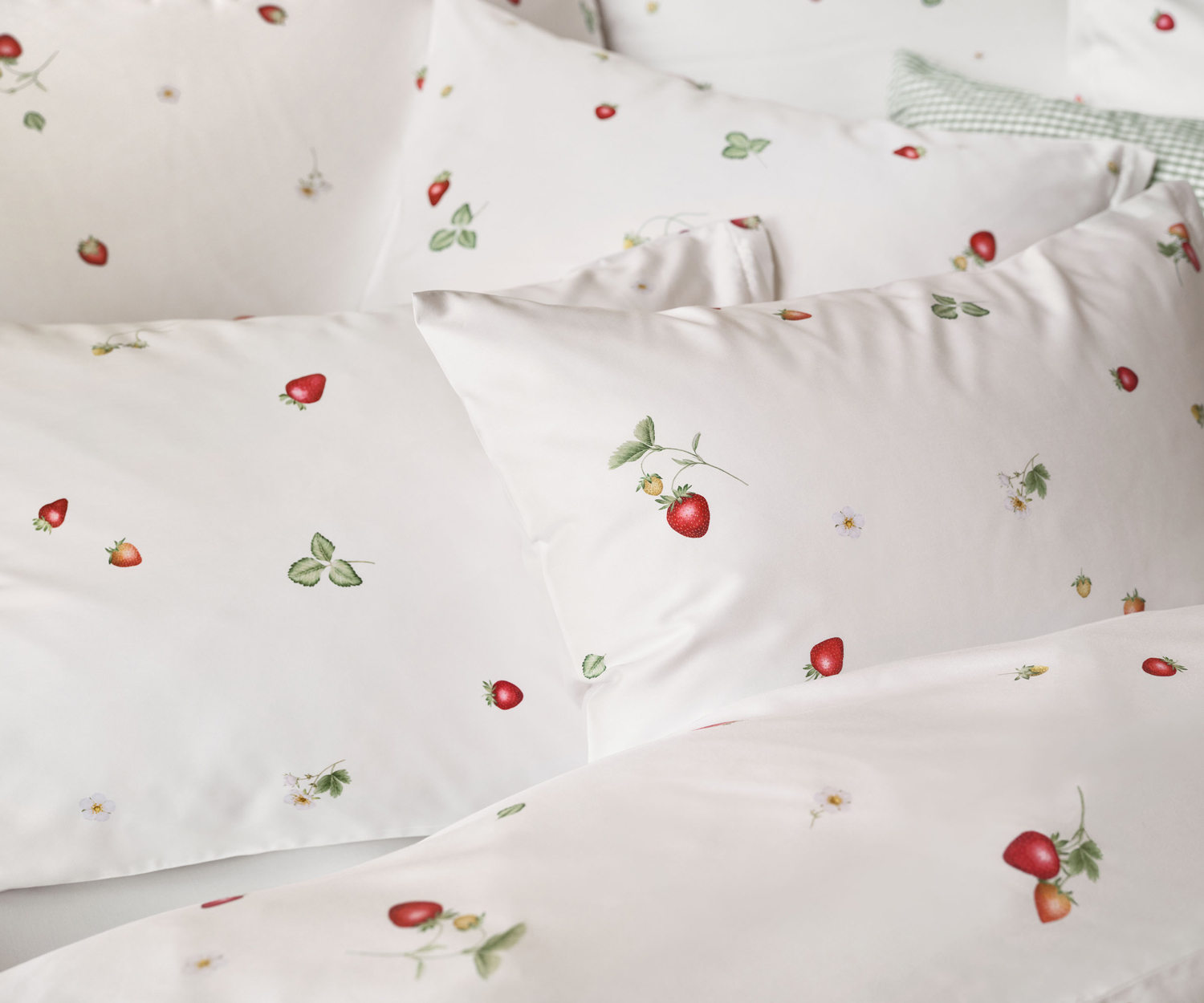 La ropa de cama JUNE captura la calma confiable de finales de primavera y la frescura del inicio del verano. Inspirada en la fresa – desde la delicada flor hasta la fruta roja intensa – el diseño combina formas limpias con tonalidades armoniosas en rojo, verde y blanco.