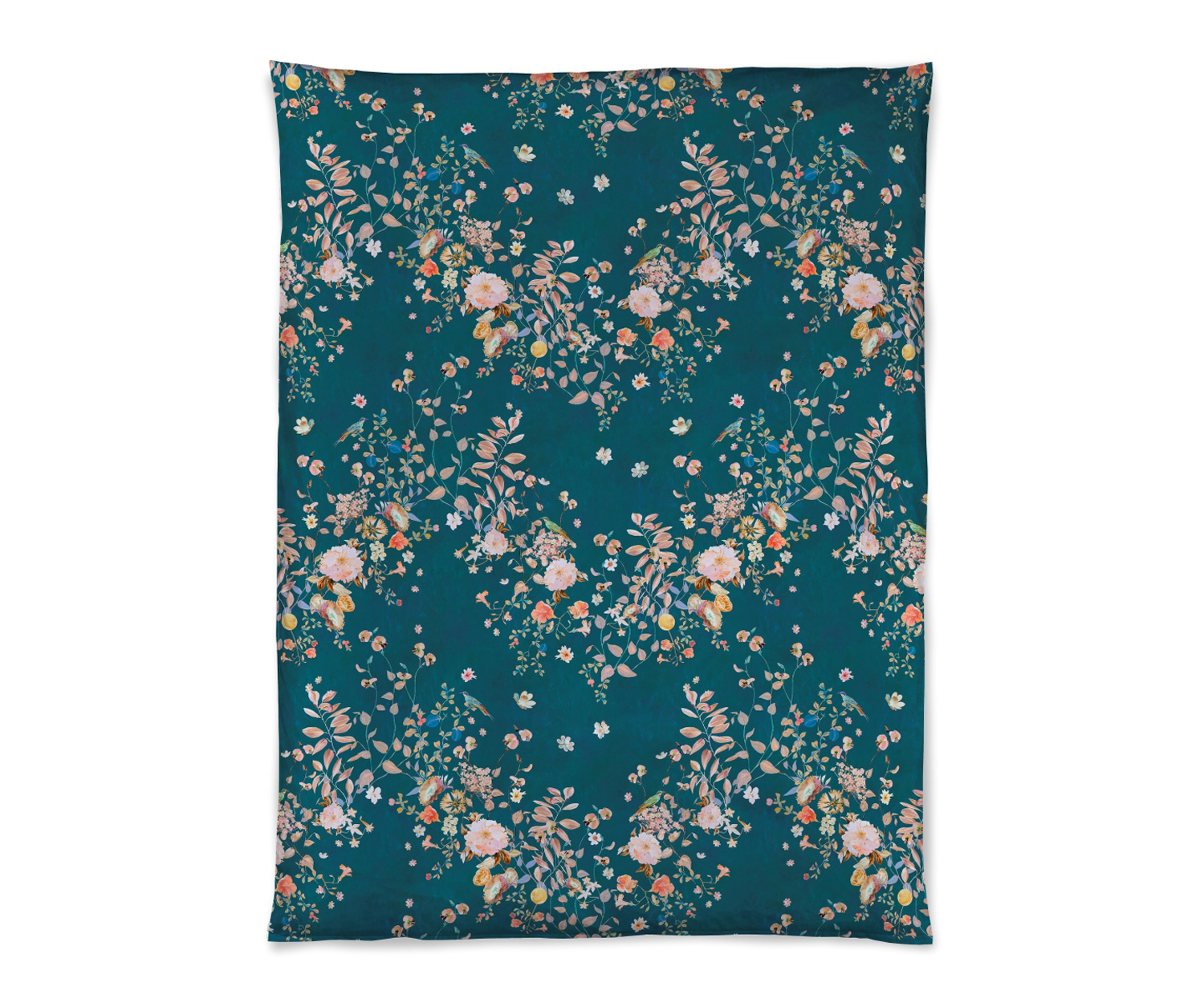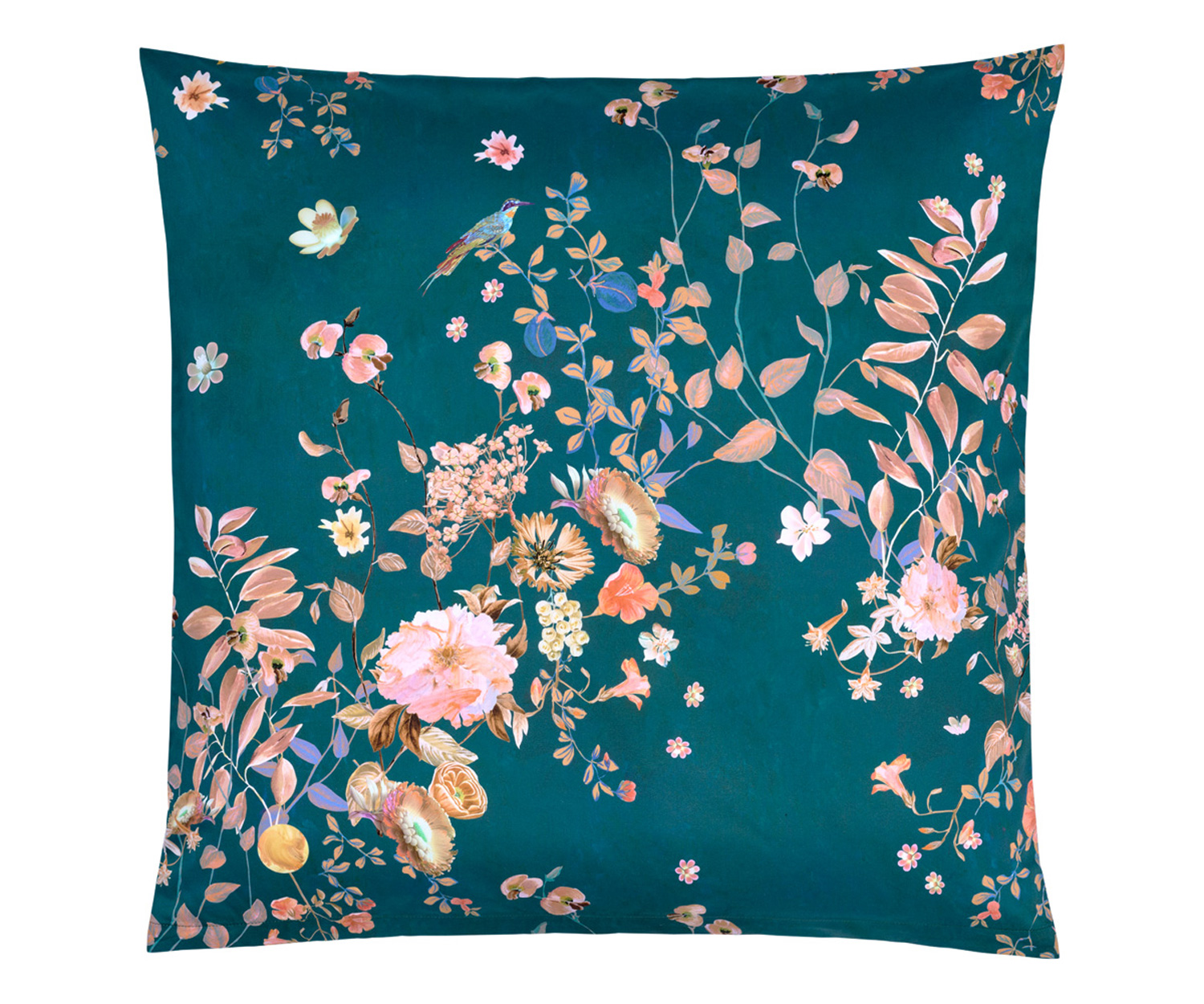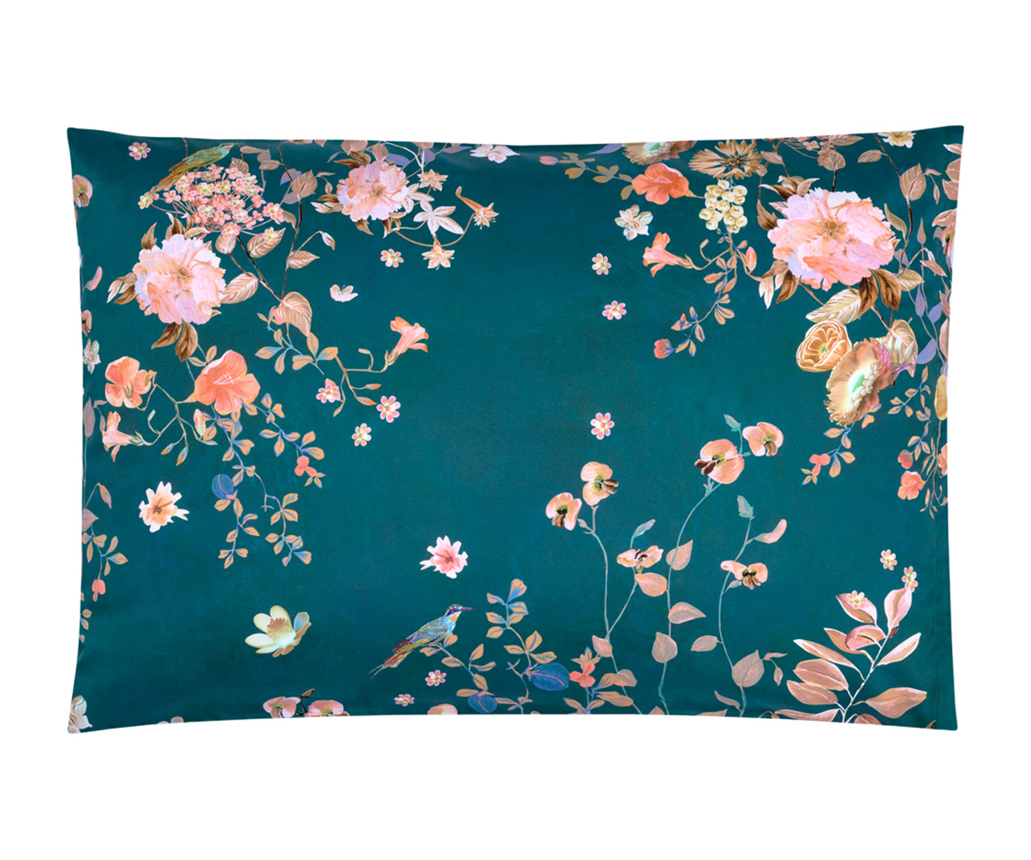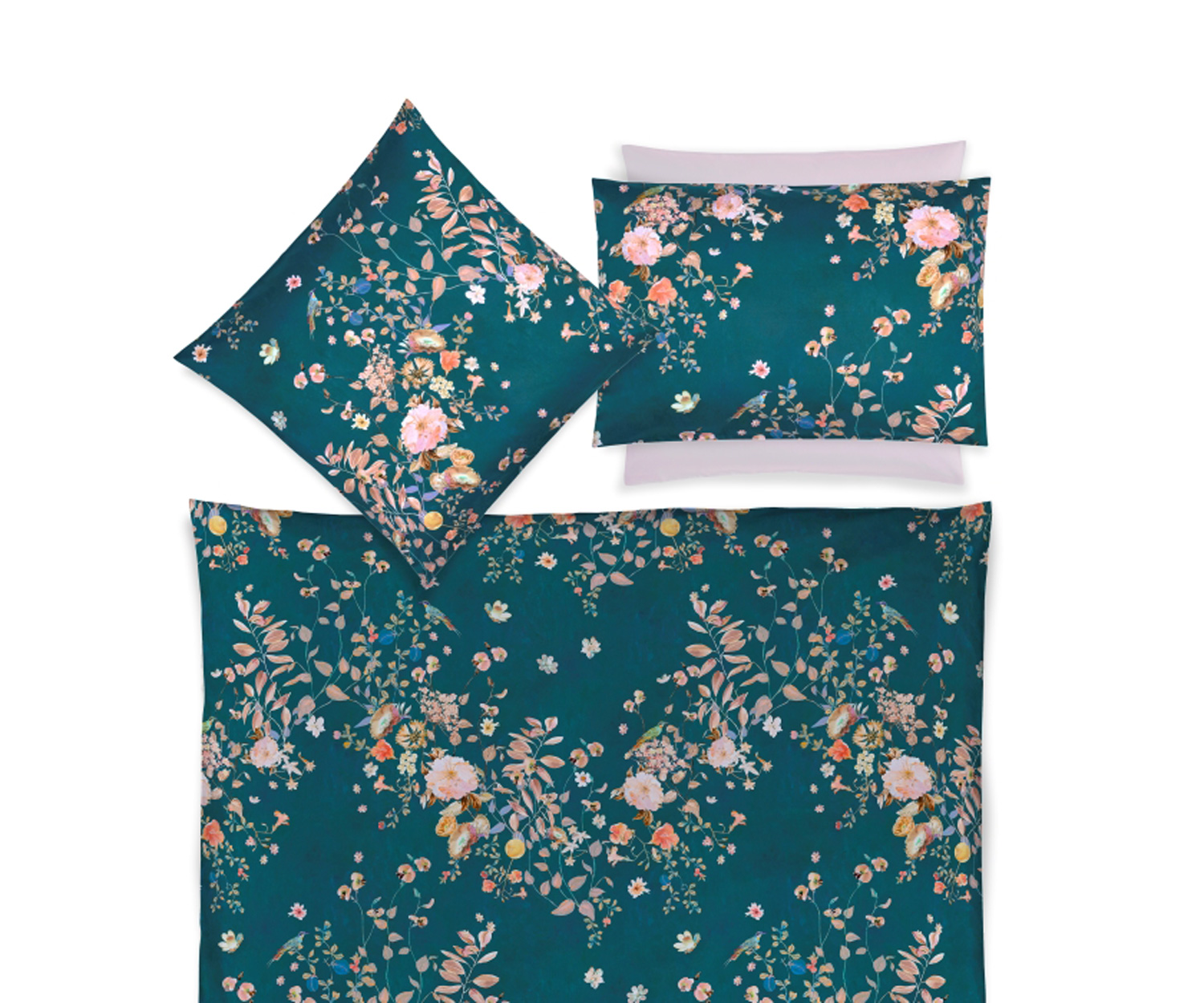 The FANTASIA bed linen whisks you away to an exotic dream world: hand-painted peonies, camellia leaves, and Australian wildflowers blend seamlessly with vibrant birds and delicately shimmering blossoms to create a captivating work of art. The fusion of traditional painting and digital finesse gives the design a contemporary edge, while the dark background and dynamic brushstrokes add depth and drama. Perfect for those who wish to transform their bedroom into a stylish, floral fantasy realm.